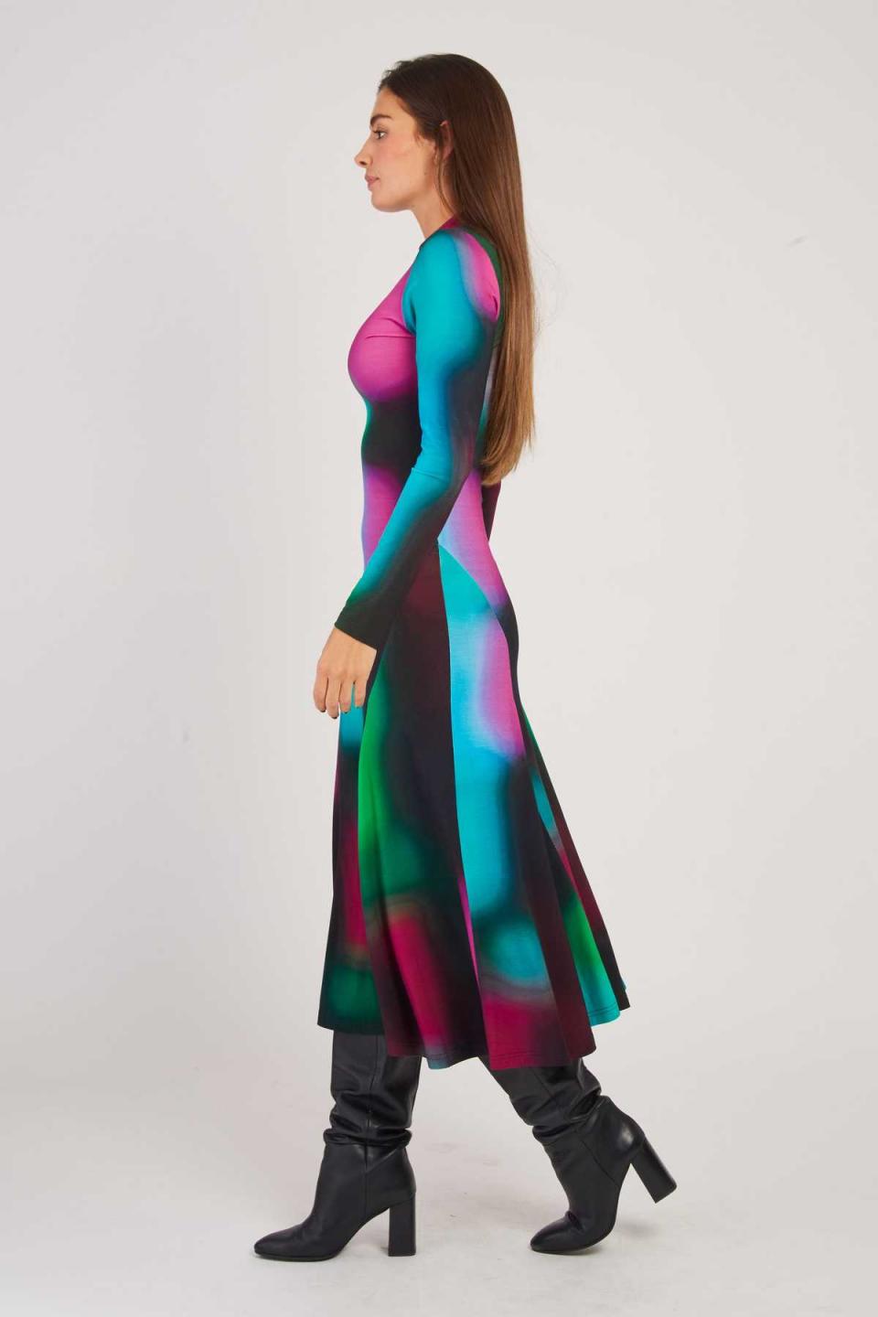 Robe longue moulante à manches longues, ornée d’un imprimé graphique abstrait pour un look unique et dynamique. Dotée d’un col rond montant, cette pièce apporte une touche de modernité et de peps à votre tenue. Elle est parfaite pour l’hiver ou la mi-saison, alliant confort et originalité. Composition : 100% VISCOSE Conseils d’entretien : Lavage à la main. Ne pas utiliser d’eau de javel – Repasser max 110 – Ne pas sécher en machine. Le mannequin porte une taille SMALL et mesure 175 cm